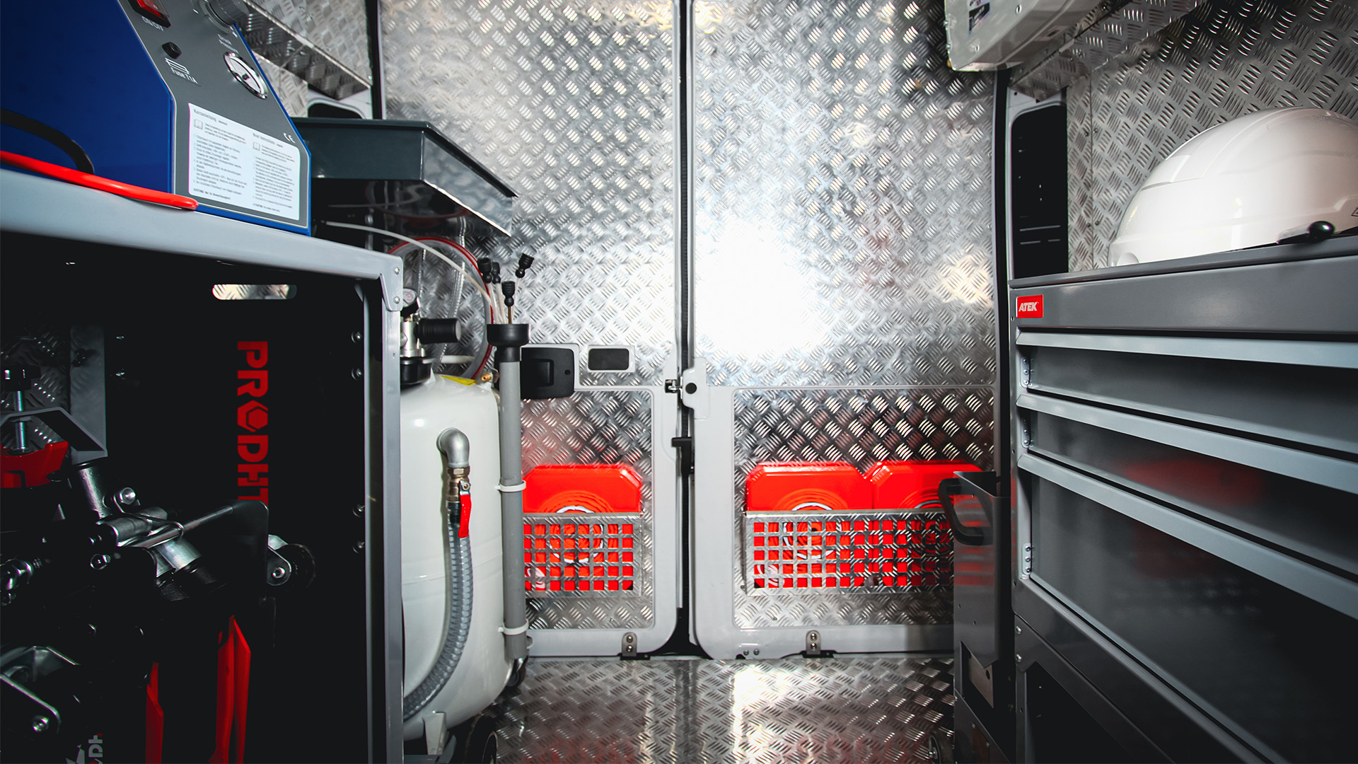 Mobil servis aracı içi yerleşim, ekipmanlara hızlı erişim ve maksimum güvenlik sağlayacak şekilde tasarlanmıştır. Arka kapıya entegre, gözler içinde gizlenmiş katlanır güvenlik kukaları, gerektiğinde hızlıca kullanıma alınarak sahada görünürlük ve güvenliği artırır. Kaymaz zemin ve sabitlenmiş modüllerle birlikte kontrollü ve verimli bir çalışma alanı sunar.